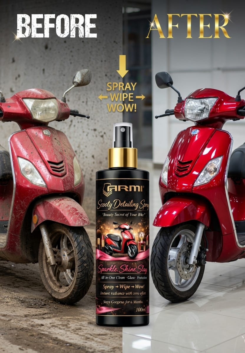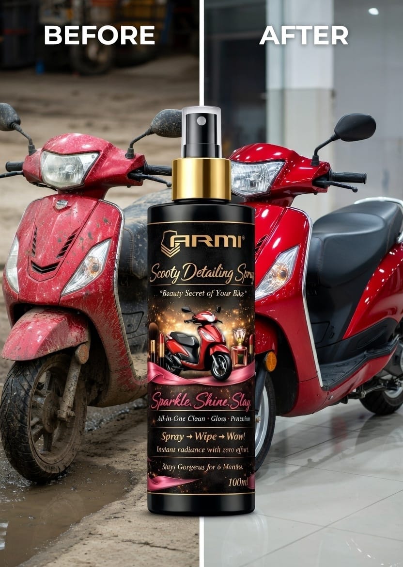 Give your scooty a showroom-fresh glow in minutes. ARMI® Scooty Detailing Spray is an all-in-one cleaning, glossing, and protection formula engineered for daily riders who want instant shine with zero effort. Just spray, wipe, and watch your scooty transform.